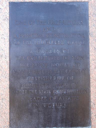 | Keywords: Loammi Baldwin by Herbert Adams, plaque - DSC04124.JPG en Loammi Baldwin memorial by Herbert Adams 1858-1945 Woburn Massachusetts USA This statue was created in 1917 and hence is now in the public domain According to the Smithsonian Institution's SIRIS system On bottom rear of sculpture near base HERBERT ADAMS SC/1917 Marked bottom left edge rear of base CAST BY/ROMAN BRONZE WORKS N Y On bronze plaque on front of base in raised letters LOAMMI BALDWIN/PATRIOT/PUBLIC OFFICIAL/BORN JANUARY 21 1745 N S /IN NORTH WOBURN/MASSACHUSETTS/DIED OCTOBER 20 1807 On bronze plaque on east side of base ONE OF THE PROPRIETORS/AND/A PRINCIPAL CONSTRUCTOR/OF THE MIDDLESEX CANAL/A MEMBER OF/THE COMMITTEE TO SIGN/THE PAPER MONEY OF/MASSACHUSETTS BAY COLONY/FIRST SHERIFF OF/MIDDLESEX COUNTY/UNDER THE STATE CONSTITUTION/A LEADER OF AFFAIRS/IN WOBURN On bronze plaque on west side of base A PARTICIPANT WITH THE/RANK OF MAJOR/IN THE BATTLES OF/LEXINGTON AND CONCORD/A COLONEL OF/THE 26TH REGIMENT OF/THE CONTINENTAL ARMY/WITH GENERAL WASHINGTON/DURING THE OCCUPATION/OF NEW YORK/AND IN THE BATTLE/OF TRENTON On bronze plaque on base of base BALDWIN APPLE/DISSEMINATOR OF THE APPLE/IN HONOR OF HIM CALLED/THE BALDWIN/WHICH PROCEEDED FROM A TREE/ORIGINALLY GROWING WILD/ABOUT TWO MILES NORTH/OF THIS MONUMENT signed Founder's mark appears 2012-02-12 own Daderot cc-zero Uploaded with UploadWizard Loammi Baldwin by Herbert Adams |
