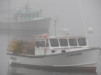 Keywords: lobster boat boats lobsters traps pots fishing fog foggy ocean sea bay harbor bar harbor maine mount desert island