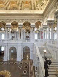 | Keywords: LoC-TJ-Great-Hall-from-2nd-floor-Highsmith.jpeg LargeImage Great Hall View from the second floor west corridor Library of Congress Thomas Jefferson Building Washington D C Once in the Great Hall you will be able to appreciate the grandeur of the architecture The ceiling 75 feet above the marble floor is decorated with stained glass skylights supported by elaborately paneled beams finished in aluminum leaf In the center of the marble floor is a large brass inlay shaped like a sun on which are inscribed the four cardinal points of the compass Bordering the sun on four sides are round medallions with 12 brass inlays representing the signs of the zodiac In niches on the west side of the hall are two bronze masks formerly used as drinking fountains On the east side is the Commemorative Arch leading back to the Main Reading Room pictured in the image on the right Inscribed into the frieze above are the words Library of Congress Above that flanked by eagles is a tablet with the names of the engineers and architects who were responsible for the design and construction of the Jefferson Building Image of the detail on one staircase in the Library of Congress' Great HallTwo grand staircases that display the work of sculptor Philip Martiny flank the Great Hall one of these staircases is shown in the image to the left Upon the newel post at the base of the railing of each staircase stands an unnamed larger-than-life-size bronze female figure holding aloft a torch Be sure to look closely at the marble figures carved into the outside of the railings These putti or small children complete with the tools of their trade represent the various occupations habits and pursuits of modern life a musician with lyre and music book; an electrician holding a telephone; and an entomologist with specimen box and butterfly net; among others Note especially the two figures flanking globes halfway up the staircase on each side On the south side of the hall are represented Africa and America with those continents shown on the globe between them; on the north side are Europe and Asia Much of the preceding text is derived from the http //www loc gov/jefftour/firstfloor html Library of Congress's virtual tour of the first floor of the Thomas Jefferson Building Library of Congress Prints Photographs Division LC-DIG-highsm-01968 original digital file http //memory loc gov/master/pnp/highsm/01900/01968u tif uncompressed archival TIFF version 175 MiB converted to JPEG quality level 88 with the GIMP 2 6 7 1896 Building and artwork designed and built 1896 by various architects and artists Photographed 2007 by Carol Highsmith 1946 “ who explicitly http //www loc gov/rr/print/res/482_high html placed the photograph in the public domain No known restriction on publication LOC-image highsm 01968 PD-old PD-Highsmith Interior of Thomas Jefferson Building Arch portals Halls Photographs by Carol M Highsmith Philip Martiny |