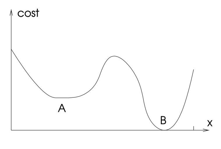 Keywords: Local-search-plateau.svg An example of plateau one variable x If local search reaches point B it will be unable to find a cost-decreasing move and stucks there even if this is not a solution while one exists at point A Constraint satisfaction 2006-02-21 own assumed Tizio |