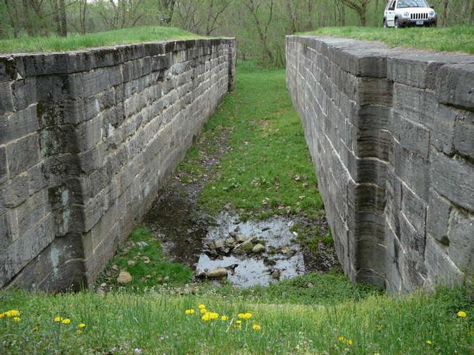 Keywords: Lock 40 on C and O from NPS.jpg en Lock 40 NPS site says Lock 40 is a gray-blue limestone lock with a 6' lift it conforms to standard dimensions A portion of the upper berm lock gate and balance beam remain on the floor of the lock The gate has two wicket gates at its base The gate was creosoted which has aided its lasting power Early movement of the lock walls is indicated by extensive cutting back of the face stones of the lock side walls particularly on the berm side Evidence points to a wood timber foundation National Park Service http //www hscl cr nps gov/insidenps/report asp STATE PARK CHOH STRUCTURE SORT RECORDNO 514 National Park Service Dept of Interior US Government Chesapeake Ohio Canal National Historical Park Locks water transport PD-USGov |