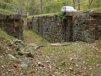| Keywords: Lock 59 C and O from NPS.jpg en Lock 59 second composite lock on Chesapeake and Ohio Canal NPS site says Lock 59 is the second of the 13 composite locks These locks differ from the other locks on the canal Between the upper end of the lower gate pockets to the lower end of the upper gate pockets the stone walls were moved 9 ¼° on each side resulting in a clear dimension between lock walls of 16 ™-16 ½ rather that the 15 ™ previously adhered to The normal clear dimension was resumed both up and down from these points The walls were of rough-cut and rough-coursed limestone principally dry-laid where the walls were widened and mortared in the other areas The wider area was filled in with 5 ¼ square timbers This wooden section of the lock was water-proofed at first by being kyanized and later with creosote The wood timbers required frequent replacing and around 1900 many repairs were made by stripping out the wood and pouring a cement liner but at Lock 59 cement was not used The wooden coping and most of the wood lining at Lock 59 is gone but a few remnants remain especially on the berm side wall In the mid-1870s Lock 59 was extended at its lower end by rock-filled wood cribbage in order to double its length The wooden portion of the extension is largely gone but the lines of rock remain National Park Service http //www hscl cr nps gov/insidenps/report asp STATE PARK CHOH STRUCTURE SORT RECORDNO 921 National Park Service Dept of Interior US Government Chesapeake Ohio Canal National Historical Park Locks water transport PD-USGov |