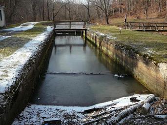 | Keywords: Lock 68 on C and O Canal from NPS.jpg en Lock 68 NPS site says Lock 68 is the 10th Composite Lock These locks differ from the other locks on the canal Between the upper end of the lower gate pockets to the lower end of the upper gate pockets the stone walls were moved 9 ¼ ™ on each side resulting in a clear dimension between lock walls of 16 ™-16 ½ rather that the 15 ™ previously adhered to The normal clear dimension was resumed both up and down from these points The walls were of rough-cut and rough-coursed limestone principally dry-laid where the walls were widened and mortared in the other areas The wider area was filled in with 5 ¼ square timbers This wooden section of the lock was water-proofed at first by being kyanized and later with creosote The wood timbers required frequent replacing and around 1900 many repairs were made by stripping out the wood and pouring a cement liner Lock 68 is nearly 2 miles below Lock 69 and 2 ½ miles above Lock 67 It has a lift of 8¼ feet Although the concrete liner is undated it was probably added in the early 1900's when most of the wood liners of the composite locks were replaced Concrete covers all the lock walls from the lower end of the upper lock gate-pockets to the start of the lower extension walls All wood coping was replaced with concrete On the towpath side spaced bolts that protrude 4 above the concrete indicate an added continuous wood member This wood extension may have been added because the concrete edge over which the tow ropes ran made the life of the tow ropes quite short Lock 68 was extended at its lower end by rock-filled wood cribbage in the 1870's to double its length Rock-filled wood cribbage was also used at the berm side upper end of the lock to divide the flow of water into the lock and the by-pass flume The lock is at it upper end dammed by a concrete wall as a result of a post-World War II endeavor to create fishing areas in the canal bed in this area There is a wooden barrier across the lower end of the lower gate pockets purpose unknown There are 12 foot high stone bridge abutments located at the lower end of the lock which carry an iron bridge over the canal LCS 45620 and a modern pedestrian bridge at the lower end National Park Service http //www hscl cr nps gov/insidenps/report asp STATE PARK CHOH STRUCTURE SORT RECORDNO 1023 National Park Service Dept of Interior US Government Chesapeake Ohio Canal National Historical Park Locks water transport PD-USGov |