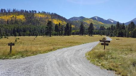 | Keywords: coconino national forest coconinonationalforest usfs flagstaff autumn fall colors fallcolors forest service forestservice forest san francisco mountain sanfranciscomountain san francisco peaks sanfranciscopeaks lockett meadow lockettmeadow lockett meadow campground lockettmeadowcampground outdoor landscape hill Fall color in Lockett Meadow, September 23, 2016. This primitive campground and day use area offers a scenic view of the San Francisco Peaks in the cool aspen trees that surround Lockett Meadow. This is a terrific campground for those who cherish a real mountain camping experience and love to hike wilderness trails. There is a small day use area, making this a beautiful place to have a picnic and enjoy the meadow and Peaks views. The Inner Basin Trail ascends from Lockett Meadow into the caldera of the San Francisco Peaks, an extinct volcano and home of the tallest peaks in Arizona. The first 1.7 miles of the trail winds through the extensive aspen forest flanking the upper reaches of the Peaks, joining the Waterline Trail briefly before following a jeep road into the caldera. The trail starts at an elevation of 8665 feet, gaining approximately 1200 feet over 2 miles on its way into the Inner Basin. The trail continues another 2 miles, gaining an additional 600 feet or so to join up with the Weatherford Trail. Photo by George Jozens, September 23, 2016. Source: U.S. Forest Service, Coconino National Forest. See Lockett Meadow Campground and Inner Basin No. 29 for information about this area of the Peaks on the Coconino National Forest website. Fall color in Lockett Meadow, September 23, 2016. This primitive campground and day use area offers a scenic view of the San Francisco Peaks in the cool aspen trees that surround Lockett Meadow. This is a terrific campground for those who cherish a real mountain camping experience and love to hike wilderness trails. There is a small day use area, making this a beautiful place to have a picnic and enjoy the meadow and Peaks views. The Inner Basin Trail ascends from Lockett Meadow into the caldera of the San Francisco Peaks, an extinct volcano and home of the tallest peaks in Arizona. The first 1.7 miles of the trail winds through the extensive aspen forest flanking the upper reaches of the Peaks, joining the Waterline Trail briefly before following a jeep road into the caldera. The trail starts at an elevation of 8665 feet, gaining approximately 1200 feet over 2 miles on its way into the Inner Basin. The trail continues another 2 miles, gaining an additional 600 feet or so to join up with the Weatherford Trail. Photo by George Jozens, September 23, 2016. Source: U.S. Forest Service, Coconino National Forest. See Lockett Meadow Campground and Inner Basin No. 29 for information about this area of the Peaks on the Coconino National Forest website. |
