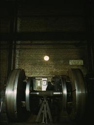 Keywords: locomotive maintenance wheels worn refacing black and white industrial retro steam railway railroad labor repair industry transportation