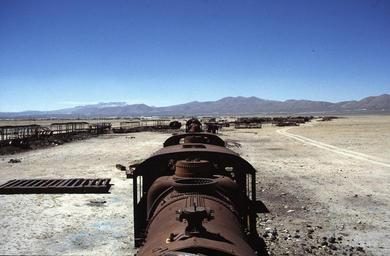 | Keywords: LocomotiveCemetaryUyuni.jpg Locomotive Cemetary near Uyuni Bolivia Lokomotivfriedhof nahe Uyuni Bolivien Photo taken by Steffen Sledz 1996-03-14 Steffen Sledz Zone42 Salar de Uyuni Steam locomotives of Bolivia Mountains of Bolivia 1996 in Bolivia Damaged rolling stock |