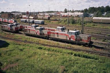 | Keywords: Locomotives in Oulu Jul2008 001.jpg VR depot and freight yard in Oulu Finland The locomotives/railcars seen in the photo include Dr16 diesel locomotives closest to the photographer Sr2 electric locomotives left a Dm7 diesel multiple unit blue an Sr1 electric locomotive background left and a Dv12 diesel locomotive background right Dr16-dieselvetureita edessä Sr2-sähkövetureita vasemmalla sininen lättähattujuna Sr1-sähköveturi taustalla vasemmalla ja Dv12-dieselveturi taustalla oikealla own Methem Mikko J Putkonen 2008-07 Cc-zero 2008 in Oulu July 2008 in Finland Rail transport in Oulu Rail yards in Finland VR Class Dr16 |