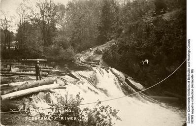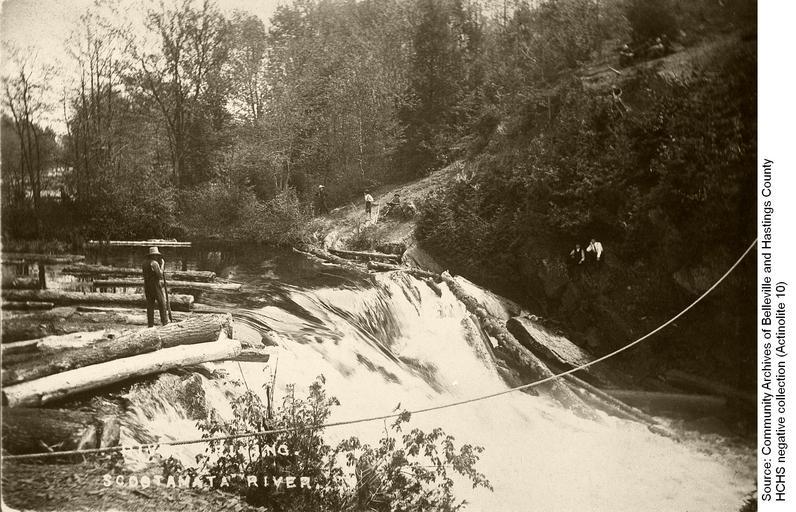 | Keywords: logging log drive logdrive actinolite billa flint billaflint skootamatta river logger pike pole pikepole moira river moirariver skootamatta river skootamattariver troy logs spring thaw springthaw belleville monochrome outdoor This photo and information contributed by the Community Archives of Belleville and Hastings County show a log driver with his pike pole being watched by three young boys from what appears to be a logging trail with six others seated on the ground nearby. Logging has been an important industry in Hastings County from its early settlement to the 21st century. Before mechanized equipment came into use, logs were felled in the winter and hauled to the riverbank to await the spring thaw. The logs were driven down the river to the sawmill when the water level was high after the spring melt. The Skootamatta River carried logs to Billa Flint's water powered sawmill at Actinolite (then named Troy), or further on to the Moira River for the longer journey down to the large mills in Belleville. Unknown date and exact location. This photo and information contributed by the Community Archives of Belleville and Hastings County show a log driver with his pike pole being watched by three young boys from what appears to be a logging trail with six others seated on the ground nearby. Logging has been an important industry in Hastings County from its early settlement to the 21st century. Before mechanized equipment came into use, logs were felled in the winter and hauled to the riverbank to await the spring thaw. The logs were driven down the river to the sawmill when the water level was high after the spring melt. The Skootamatta River carried logs to Billa Flint's water powered sawmill at Actinolite (then named Troy), or further on to the Moira River for the longer journey down to the large mills in Belleville. Unknown date and exact location. |
