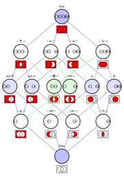 | Keywords: Logical connectives Hasse diagram.svg Rhombic dodecahedron <br> 410px Logical connectives <br> margin 0 auto; - <imagemap> Image Logical connectives table svg 380px rect 399 2 542 39 input A rect 400 39 540 73 input B rect 400 128 542 706 output f A B rect 3 128 398 163 X and ¬X rect 3 162 398 199 A and B rect 3 198 398 235 ¬A and B rect 4 234 399 273 B rect 3 273 398 309 A and ¬B rect 2 308 397 344 A rect 2 344 396 379 A xor B rect 2 379 397 415 A or B rect 3 419 396 454 ¬A and ¬B rect 3 453 395 489 A xnor B rect 3 489 396 525 ¬A rect 3 525 396 560 ¬A or B rect 3 563 397 601 ¬B rect 2 600 395 636 A or ¬B rect 2 634 398 671 ¬A or ¬B rect 3 670 397 706 X or ¬X desc none </imagemap> 50pt <imagemap> Image Logical connectives Hasse diagram svg 350px rect 326 28 416 200 X or ¬X rect 81 233 166 409 ¬A or ¬B rect 260 231 349 409 A or ¬B rect 393 230 481 409 ¬A or B rect 574 232 663 408 A or B rect 13 436 103 617 ¬B rect 147 438 235 617 ¬A rect 279 440 368 616 A xor B rect 375 440 464 617 A xnor B rect 507 439 595 617 A rect 639 438 732 617 B rect 79 647 168 826 ¬A and ¬B rect 260 647 349 826 A and ¬B rect 392 646 482 826 ¬A and B rect 574 646 663 826 A and B rect 327 853 417 1035 X and ¬X desc none </imagemap> - left <small><font color aaaaaa> Logical connectives table and Hasse diagram </font></small> <br clear all> The sixteen logical connectives ordered in a Hasse diagram They are represented by logical formulas the 16 elements of V<sub>4</sub> P 4 <nowiki> </nowiki> Venn diagrams The nodes are connected like the vertices of a 4 dimensional cube The light blue edges form a rhombic dodecahedron - the convex hull of the tesseract's vertex-first shadow in 3 dimensions own Mate2code 2009-05-15 Printable versions File Logical connectives Hasse diagram pdf File Logical connectives table and Hasse diagram pdf See also File Elements of P 4 empty set in Hasse diagram svg Tesseract Hasse diagrams Rhombic dodecahedral tesseract shadow; 16 vertices Johnston diagrams Propositional logic Colored nibbles blue green white Nested set V4 |