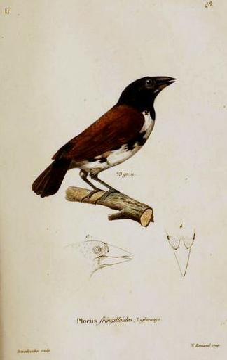 | Keywords: Lonchura fringilloides.JPG en Lonchura fringilloides or Spermestes fringilloides Plocus Lonchura fringilloïdes Lafresnaye 1835 1835-01-01 15 18 45 http //www biodiversitylibrary org/item/114196 page/447/mode/1up here Christophe Annedouche 1803-1866 sculp other versions PD-old-70-1923 Christophe Annedouche Magasin de zoologie d'anatomie comparée et de palaeontologie Lonchura fringilloides | ||||