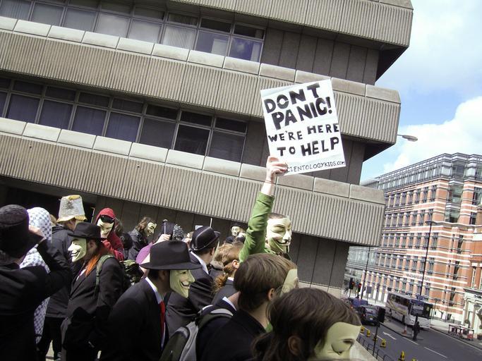 | Keywords: London QVS April 12 2008 0002 Dontpanic.jpg Sign held above protestors at the Queen Victoria Street protest Own 2008-03-15 JamesHarrison Own work all rights released Public domain Protests by Anonymous against Scientology in London April 2008 |
