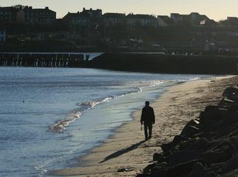 Keywords: lonely walk quiet beach shadow sand sea silhouette sunlight coastline
