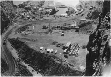 | Keywords: Looking down onto downstream rock backwash barrier. Construction road operates against Arizona abutment. - NARA - 293797.jpg Scope and content Photograph from Volume Two of a series of photo albums documenting the construction of Hoover Dam Boulder City Nevada General notes 293797 Local identifier Department of the Interior Bureau of Reclamation Engineering and Research Center 05/18/1981 - 03/04/1988 NARA's Rocky Mountain Region Denver NRGA Building 48 Denver Federal Center West 6th Avenue and Kipling Street Denver CO 80225-0307 1933-02-10 Record group Record Group 115 Records of the Bureau of Reclamation 1889 - 2008 Record group ARC 444 Photograph albums compiled 1903 - 1972 Series ARC 293611 File unit File unit ARC Variant control numbers NAIL Control Number NRG-115-CONSTPHO85006-BC21525 Other versions <gallery> File Looking down onto downstream rock backwash barrier Construction road operates against Arizona abutment - NARA - 293797 tiff tif File Looking down onto downstream rock backwash barrier Construction road operates against Arizona abutment - NARA - 293797 jpg jpg </gallery> NARA-cooperation PD-USGov Construction of the Hoover Dam |