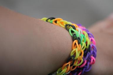 Keywords: loom arm bracelet hand wrist jewellery colorful black orange yellow green violet pink color child close joy of life tinker
