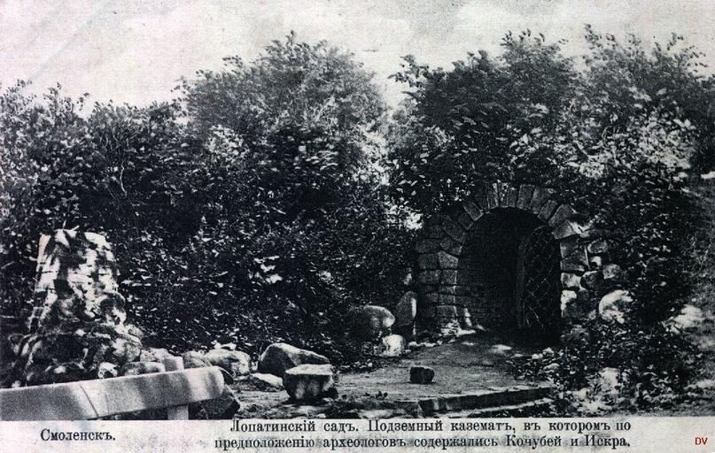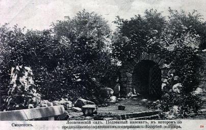 | Keywords: Lopatinskiy garden, the entrance to the dungeon 2.jpg en Lopatinsky garden in Smolensk The entrance to the underground dungeon under royal stronghold in which by assumption archaeologists at one time contained issued by Peter the Great Hetman Mazepa and Kochubey Colonel Iskra now bricked up ru Лопатинский сад в Смоленске Вход в подземный каземат под ко олевским бастионом в кото ом по п едположению а хеологов одно в емя соде жались выданные Пет ом Пе вым гетману азепе полковники Кочубей и Иск а ныне заму ован О игинальная отк ытка е установлены before 1917 года PD-RusEmpire 20th-century postcards Postcards of Smolensk Lopatinsky garden |
