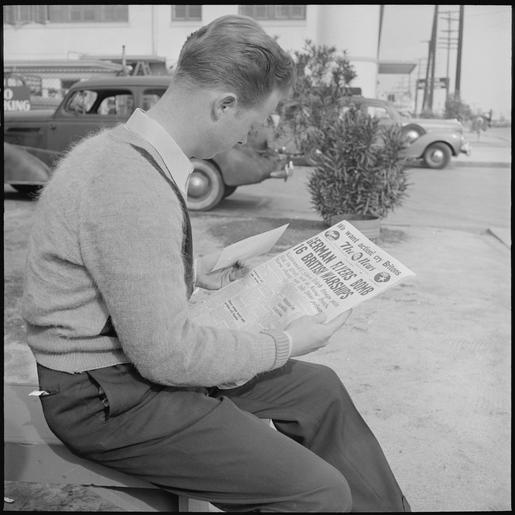 | Keywords: Los Angeles, California. Lockheed Employment. Cause and Effect. This young man reading the war news holds an... - NARA - 532213.tif Scope and content General notes 532213 Local identifier 119-CAL-156 Federal Security Agency National Youth Administration 07/01/1939 - 09/17/1942 NARA-Author Partridge Rondal 1917- Photographer 8464464 <br /> Still Picture Records Section Special Media Archives Services Division NWCS-S National Archives at College Park 8601 Adelphi Road College Park MD 20740-6001 1940-04-29 Record group Record Group 119 Records of the National Youth Administration 1934 - 1945 Record group ARC 448 Study of Youth Photographs compiled 1940 - 1940 Series ARC 532065 File unit File unit ARC Variant control numbers NAIL Control Number NWDNS-119-CAL-156 yes Other versions NARA-cooperation PD-USGov Lockheed Aircraft Plant Burbank Men at work in California People of Los Angeles 1940 Fashion in 1940 1940 in Los Angeles Rondal Partridge NARA images of Los Angeles County California Black and white photographs of sitting men CA 1940 in aviation |