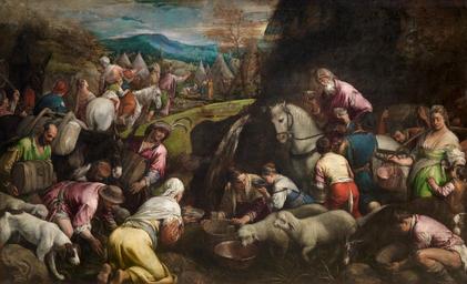 | Keywords: Los israelitas bebiendo el agua milagrosa, de Jacopo Bassano (Museo del Prado).jpg La obra representa dos pasajes del Antiguo Testamento y en primer plano aparecen los israelitas saciando bebiendo agua de la fuente que el profeta Moisés había hecho brotar previamente de la roca de Horeb y en un plano intermedio aparecen Moisés y su hermano Aarón conduciendo a los israelitas hacia la Tierra Prometida circa 1566 1568 oil on canvas Size cm 230 146 Institution Museo del Prado https //www museodelprado es/coleccion/obra-de-arte/los-israelitas-bebiendo-el-agua-milagrosa/7053eaaa-6ef4-4e61-9cf6-4d71a463d306 accession number P06312 https //content1 cdnprado net/imagenes/Documentos/imgsem/70/7053/7053eaaa-6ef4-4e61-9cf6-4d71a463d306/ae287aee-a398-4abc-9198-a4ba2fcab831 jpg PD-old-100 Paintings of Moses in Spain 16th-century paintings of Moses Aaron in paintings Paintings by Jacopo da Ponte Paintings by Jacopo da Ponte in the Prado Museum Italian paintings in the Museo del Prado Bassano 16th-century paintings in the Prado Museum 1560s paintings in Spain |