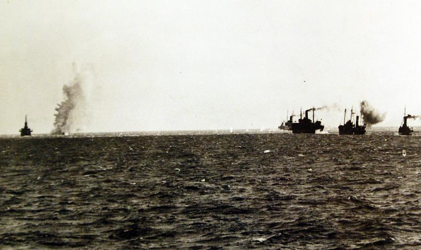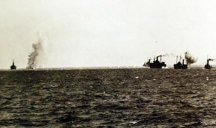 | Keywords: outdoor monochrome Lot 11559-6: Atlantic Convoys. A ship in convoy during an actual attack by enemy shellfire and bombs. Escorting Royal Navy warships laid smoke screens when the German guns on the French coast fired 80 shells in 80 minutes as the convoy went through the narrowest part of the Straits. Shells from the German battery on the French coast falling harmlessly all around the ships of the convoy, possible 1941. Office of War Information photograph, 7894-ZE. (2016/01/29). Lot 11559-6: Atlantic Convoys. A ship in convoy during an actual attack by enemy shellfire and bombs. Escorting Royal Navy warships laid smoke screens when the German guns on the French coast fired 80 shells in 80 minutes as the convoy went through the narrowest part of the Straits. Shells from the German battery on the French coast falling harmlessly all around the ships of the convoy, possible 1941. Office of War Information photograph, 7894-ZE. (2016/01/29). |
