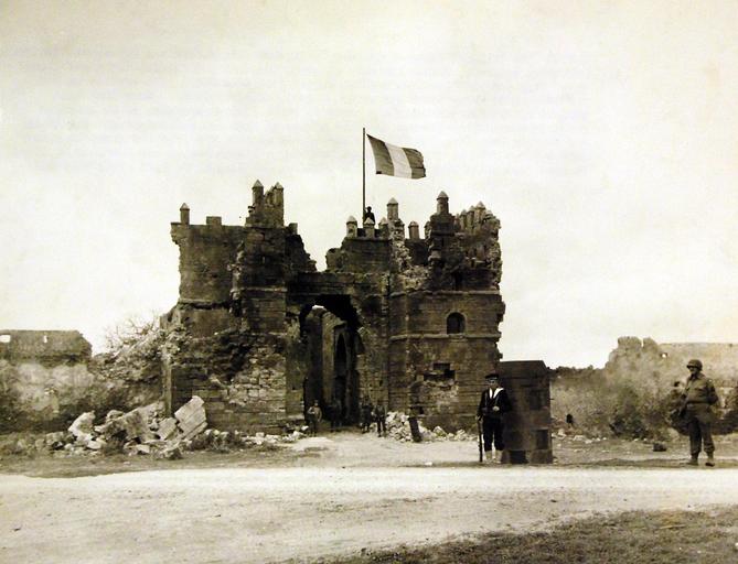 | Keywords: outdoor monochrome Lot-11573-1: North African Campaign, November 1942 to May 1943. The Tricolor flies again over the Kasbah Mehdia, ancient Portuguese fortress near Fort Lyautey, French Morocco, although the fortress capitulated after three days’ fighting with American landing forces in November. The portion of the fortress shown above bears the marks of American bombardment. Near this spot, visited by President Franklin D. Roosevelt’s part in North Africa is an American cemetery where white crosses mark the graves of American soldiers who died. The Stars and Stripes hang from the flagpole there, and against the pole the American party laid a large wreath. The photograph, showing a French sentry and American soldiers at ease. Photographed probably late January 1943. Office of War Information Photograph. Courtesy of the Library of Congress. (2016/06/17). Lot-11573-1: North African Campaign, November 1942 to May 1943. The Tricolor flies again over the Kasbah Mehdia, ancient Portuguese fortress near Fort Lyautey, French Morocco, although the fortress capitulated after three days’ fighting with American landing forces in November. The portion of the fortress shown above bears the marks of American bombardment. Near this spot, visited by President Franklin D. Roosevelt’s part in North Africa is an American cemetery where white crosses mark the graves of American soldiers who died. The Stars and Stripes hang from the flagpole there, and against the pole the American party laid a large wreath. The photograph, showing a French sentry and American soldiers at ease. Photographed probably late January 1943. Office of War Information Photograph. Courtesy of the Library of Congress. (2016/06/17). |