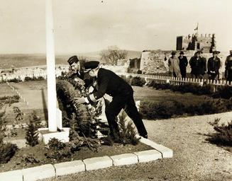 | Keywords: outdoor Lot-11573-4: North African Campaign, November 1942 to May 1943. French Morocco, Africa. General Mark Clark and Captain John L. McCrea, a Naval aide, laying the Presidential wreath against a flagpole in the U.S. Military Cemetery, near the entrance to the Kasbah Mehdia, ancient Portuguese fortress near Port Lyautey around which fighting raged for three days when the Americans landed in French Morocco in November 1942. Close to this flagpole are white crosses marking graves of American soldiers and behind them are French graves. Photographed January 1943. U.S. Army Photograph, from Office of War Information Collection. Courtesy of the Library of Congress. (2016/06/17). Lot-11573-4: North African Campaign, November 1942 to May 1943. French Morocco, Africa. General Mark Clark and Captain John L. McCrea, a Naval aide, laying the Presidential wreath against a flagpole in the U.S. Military Cemetery, near the entrance to the Kasbah Mehdia, ancient Portuguese fortress near Port Lyautey around which fighting raged for three days when the Americans landed in French Morocco in November 1942. Close to this flagpole are white crosses marking graves of American soldiers and behind them are French graves. Photographed January 1943. U.S. Army Photograph, from Office of War Information Collection. Courtesy of the Library of Congress. (2016/06/17). |
