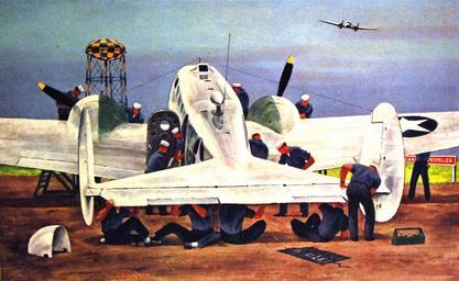 | Keywords: outdoor Lot 3124-4: Paintings of Naval Aviation during World War II: Abbott Collection. #49: “Ready on the Line” Artwork by Joseph Hirsch. “But first, before the Navy gives its airplanes into the hands of the crews, a rigid schedule of inspection and maintenance must be observed. This is the 30-hour check, when plane captain and his crew swarm over the Beechcraft transport to insure airworthiness. The engine, propeller, cowling, skin, controls, rudders, every part is checked and inspected for the effects of wear and weather. Note here the quartet beneath the empennage going over every inch of the elevator and its controls.” (7/10/2015). Lot 3124-4: Paintings of Naval Aviation during World War II: Abbott Collection. #49: “Ready on the Line” Artwork by Joseph Hirsch. “But first, before the Navy gives its airplanes into the hands of the crews, a rigid schedule of inspection and maintenance must be observed. This is the 30-hour check, when plane captain and his crew swarm over the Beechcraft transport to insure airworthiness. The engine, propeller, cowling, skin, controls, rudders, every part is checked and inspected for the effects of wear and weather. Note here the quartet beneath the empennage going over every inch of the elevator and its controls.” (7/10/2015). |