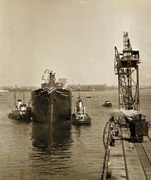 | Keywords: outdoor monochrome Lot-3452-7: Biography of a Liberty Ship. Less than five months from keel-laying to launching ceremony was the record set by SS Patrick Henry. This time is being reduced to sixty days in the construction of her sister ships of the Liberty Ship design. This standard design was selected by the Maritime Commission to meet the need for a ship that can be built in existing yards in minimum time with the additional purpose of conserving materials vitally needed for the war production effort. Prefabrication of sections in special plants, replacing of riveting wherever possible by welding and other new departures all contribute to the speed of construction and saving of material and dead weight in these ships which are already proving their worth in the War on the Axis. On 27 September 1941, SS Patrick Henry, the first U.S. Liberty ship, was launched at Baltimore, Maryland. Numerous other vessels were launched on that day, known as "Liberty Fleet Day." Surviving World War II, Patrick Henry was scrapped in 1960. U.S. Office of Emergency Management Photograph. Courtesy of the Library of Congress. (2015/05/06). Lot-3452-7: Biography of a Liberty Ship. Less than five months from keel-laying to launching ceremony was the record set by SS Patrick Henry. This time is being reduced to sixty days in the construction of her sister ships of the Liberty Ship design. This standard design was selected by the Maritime Commission to meet the need for a ship that can be built in existing yards in minimum time with the additional purpose of conserving materials vitally needed for the war production effort. Prefabrication of sections in special plants, replacing of riveting wherever possible by welding and other new departures all contribute to the speed of construction and saving of material and dead weight in these ships which are already proving their worth in the War on the Axis. On 27 September 1941, SS Patrick Henry, the first U.S. Liberty ship, was launched at Baltimore, Maryland. Numerous other vessels were launched on that day, known as "Liberty Fleet Day." Surviving World War II, Patrick Henry was scrapped in 1960. U.S. Office of Emergency Management Photograph. Courtesy of the Library of Congress. (2015/05/06). |