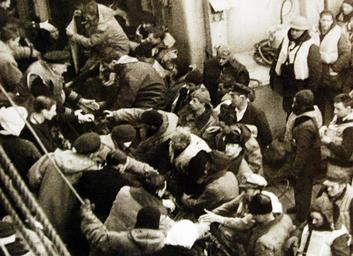 | Keywords: people crowd Lot-3478-32: British Activities, WWII. Biggest Allied Convoy Fights Through To Russia. The biggest Allied convoy to Russia fought through a four-day attack by enemy torpedo planes and U-boats to deliver her cargoes to an Arctic port. The Commodore of this convoy was Rear Admiral E.K. Boddam-Whetham, D.S.C. and the escorting forces were under the command of Rear Admiral R.L. Burnett, O.B.E., flying his flag aboard HMS Scylla (Captain I.A.P. McIntrye, C.B.E.). Picture shows: Survivors from a merchantman sunk by enemy action are transferred from one ship to another during the voyage. Office of Emergency Management. (2016/03/04). Lot-3478-32: British Activities, WWII. Biggest Allied Convoy Fights Through To Russia. The biggest Allied convoy to Russia fought through a four-day attack by enemy torpedo planes and U-boats to deliver her cargoes to an Arctic port. The Commodore of this convoy was Rear Admiral E.K. Boddam-Whetham, D.S.C. and the escorting forces were under the command of Rear Admiral R.L. Burnett, O.B.E., flying his flag aboard HMS Scylla (Captain I.A.P. McIntrye, C.B.E.). Picture shows: Survivors from a merchantman sunk by enemy action are transferred from one ship to another during the voyage. Office of Emergency Management. (2016/03/04). |