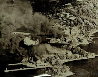 | Keywords: Lot-5279-2: U.S. Forces Small Japanese Bases in Western Caroline Islands, 29-30 March 1944. Thick smoke mushrooms skyward from Japanese positions on Yap Island pounded by American carrier-based bombers during a U.S. Navy Task Force 58 assault on enemy bases. U.S. surface units and planes sank 28 Japanese ships, damaged 18 others, destroyed 160 enemy planes and probably wrecked another 54 during the assault. The raid cost U.S. forces 18 men and 25 planes. U.S. Navy Photograph. (2015/10/30). Note: TF 58 began bombing of Japanese airfields, shipping, fleet servicing facilities, and other installations at Palau, Yap, Ulithi, and Woleai in the Carolines. TBFs and TBMs from USS Lexington (CV 16), USS Bunker Hill (CV 19), and USS Hornet (CV 12) bombed extensive minefields in and around the channels and approaches to the Palaus in the first tactical use of mines laid by carrier aircraft. Lot-5279-2: U.S. Forces Small Japanese Bases in Western Caroline Islands, 29-30 March 1944. Thick smoke mushrooms skyward from Japanese positions on Yap Island pounded by American carrier-based bombers during a U.S. Navy Task Force 58 assault on enemy bases. U.S. surface units and planes sank 28 Japanese ships, damaged 18 others, destroyed 160 enemy planes and probably wrecked another 54 during the assault. The raid cost U.S. forces 18 men and 25 planes. U.S. Navy Photograph. (2015/10/30). Note: TF 58 began bombing of Japanese airfields, shipping, fleet servicing facilities, and other installations at Palau, Yap, Ulithi, and Woleai in the Carolines. TBFs and TBMs from USS Lexington (CV 16), USS Bunker Hill (CV 19), and USS Hornet (CV 12) bombed extensive minefields in and around the channels and approaches to the Palaus in the first tactical use of mines laid by carrier aircraft. |