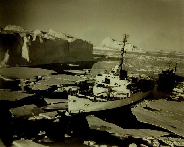 | Keywords: monochrome Lot 5967-1:  U.S. Coast Guard Icebreakers and U.S. Navy Task Group in Arctic Mission.  Looking like cracked white frosting on a chocolate cake are these big sheets of ice, as the U.S. Coast Guard Cutter Eastwind (WAGB-279) travels through them.  The ship’s helicopter hovers near to get this shot of the vessel and the ocean-going tug following close behind during a recent Arctic cruise.  Note the huge icebergs in the background.   The Coast Guard ice-breakers Eastwind and Northwind (WAGB-282) were among the heavy-duty icebreakers in a Navy Task Group which raced against time during the brief Arctic “summer” on two missions known operationally as NANOOK 52 (supplying icebound weather stations in the Arctic) and SUMAC.  Official U.S. Coast Guard Photograph, release September 1952.  Photographed through Mylar sleeve.  (2015/10/09).  Lot 5967-1:  U.S. Coast Guard Icebreakers and U.S. Navy Task Group in Arctic Mission.  Looking like cracked white frosting on a chocolate cake are these big sheets of ice, as the U.S. Coast Guard Cutter Eastwind (WAGB-279) travels through them.  The ship’s helicopter hovers near to get this shot of the vessel and the ocean-going tug following close behind during a recent Arctic cruise.  Note the huge icebergs in the background.   The Coast Guard ice-breakers Eastwind and Northwind (WAGB-282) were among the heavy-duty icebreakers in a Navy Task Group which raced against time during the brief Arctic “summer” on two missions known operationally as NANOOK 52 (supplying icebound weather stations in the Arctic) and SUMAC.  Official U.S. Coast Guard Photograph, release September 1952.  Photographed through Mylar sleeve.  (2015/10/09).   |