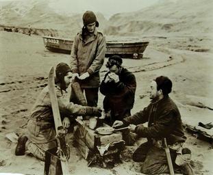 | Keywords: people Lot-803-26: Aleutian Islands Campaign, June 1942 - August 1943. Allied Landing on Attu Island, May 11 1943. The Chow Was Hot, The Company Congenial. There was nothing fancy about this meal prepared by sailors in the Holtz Bay area on May 19, but the food was hot. Note the ski standing upright in the foreground. Snow can be found year round on Attu Island. Note the reused Japanese landing boat in the background. U.S. Navy photograph, released May 29, 1943. Photographed through Mylar sleeve. (2015/11/06). Lot-803-26: Aleutian Islands Campaign, June 1942 - August 1943. Allied Landing on Attu Island, May 11 1943. The Chow Was Hot, The Company Congenial. There was nothing fancy about this meal prepared by sailors in the Holtz Bay area on May 19, but the food was hot. Note the ski standing upright in the foreground. Snow can be found year round on Attu Island. Note the reused Japanese landing boat in the background. U.S. Navy photograph, released May 29, 1943. Photographed through Mylar sleeve. (2015/11/06). |