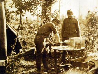 | Keywords: Lot-8329-5: American Expeditionary Forces, WWI. Cookies at the Front. The mess Sergeant John W. Pifer, 130th Infantry Supply Company, 33rd Division, is rolling out the dough with a bottle, while Private First Class Peter Bates, of the same organization looks on in happy anticipation. This kitchen is located in the woods near the “Grande Tranchee de Colonne.” Near St. Remy, France, October 30th, 1918. U.S. Army Signal Corps Photograph. Courtesy of the Library of Congress. (2016/10/28). Lot-8329-5: American Expeditionary Forces, WWI. Cookies at the Front. The mess Sergeant John W. Pifer, 130th Infantry Supply Company, 33rd Division, is rolling out the dough with a bottle, while Private First Class Peter Bates, of the same organization looks on in happy anticipation. This kitchen is located in the woods near the “Grande Tranchee de Colonne.” Near St. Remy, France, October 30th, 1918. U.S. Army Signal Corps Photograph. Courtesy of the Library of Congress. (2016/10/28). |