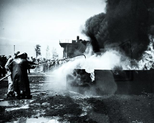 Keywords: outdoor monochrome Lot-840-10: “Firemen of the Fleet,” August 15, 1943. In peace or war, there is one foe eternally feared by every man that goes to sea – fire. In wartime, fire is twice as deadly in peace. Ignited by enemy shells or bombs, the flames menace personnel already busy at their battle stations – and every man called from his post gives the foe that much more advantage during action. Thus the Navy has founded fire-fighting schools to train specialists in the grim art of extinguishing fires anywhere aboard ship quickly and methodically. Different methods are taught the seagoing fireman for combatting flames in different sections of the ship. To lend realism to the courses, substantial “mock-ups” of vessels have been built, in which the trainees learn their grim lessons, mater the use of their flame-fighting equipment. Shown: Officers Fight Flames Too! Enrollment in firefighting school isn’t limited to enlisted men. These two officers get pointers from an instructor during assault on an open tank oil fire. U.S. Navy Photograph. Courtesy of the Library of Congress. (2016/04/14). Photographed through Mylar sleeve. Lot-840-10: “Firemen of the Fleet,” August 15, 1943. In peace or war, there is one foe eternally feared by every man that goes to sea – fire. In wartime, fire is twice as deadly in peace. Ignited by enemy shells or bombs, the flames menace personnel already busy at their battle stations – and every man called from his post gives the foe that much more advantage during action. Thus the Navy has founded fire-fighting schools to train specialists in the grim art of extinguishing fires anywhere aboard ship quickly and methodically. Different methods are taught the seagoing fireman for combatting flames in different sections of the ship. To lend realism to the courses, substantial “mock-ups” of vessels have been built, in which the trainees learn their grim lessons, mater the use of their flame-fighting equipment. Shown: Officers Fight Flames Too! Enrollment in firefighting school isn’t limited to enlisted men. These two officers get pointers from an instructor during assault on an open tank oil fire. U.S. Navy Photograph. Courtesy of the Library of Congress. (2016/04/14). Photographed through Mylar sleeve.