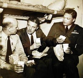 | Keywords: people Lot-926-3: The Navy’s Own Airline. Any mention of aircraft in war time invariably connotes the deadly use of planes as offensive and defensive weapons – bombers, fighters, and the varying adaptations of these two general classes. Yet, even in war, the plane is filling the function which was its biggest role in peacetime – and will be even more important when peace comes again. That is, the task of delivering passenger and freight. Flying under the aegis of the Naval Air Transportation Service (NATS), giant R4D planes (the equivalent of DC-5’s) transport men and material of war all over the world to the fronts where they are needed the most. Founded five days after the Pearl Harbor attack, NATS today links five continents, spans many seas in its unending traffic runs. Its ever-growing staff of pilots and groundsmen now includes 2,500 men. Run in business-like fashion, according to minutely-timed schedules, NATS operates 60,000 miles of flight, stopping at every type of field from jungle “whistle-stops” to metropolitan airports. Shown: At War In the Air. Veterans of many flights, Captain James E. Dyer, USN, Lieutenant Commander Henry C. Hollenbeck, USNR, and Commodore Lesley E. Gehres, USN, (left to right) of the U.S. Navy are perfectly at ease as they chat and chow aboard a NATS plane en route from Seattle to Adak. Navy Photograph, released October 5, 1943. Courtesy of the Library of Congress. (2016/04/14). Note, photographed through Mylar sleeve. Lot-926-3: The Navy’s Own Airline. Any mention of aircraft in war time invariably connotes the deadly use of planes as offensive and defensive weapons – bombers, fighters, and the varying adaptations of these two general classes. Yet, even in war, the plane is filling the function which was its biggest role in peacetime – and will be even more important when peace comes again. That is, the task of delivering passenger and freight. Flying under the aegis of the Naval Air Transportation Service (NATS), giant R4D planes (the equivalent of DC-5’s) transport men and material of war all over the world to the fronts where they are needed the most. Founded five days after the Pearl Harbor attack, NATS today links five continents, spans many seas in its unending traffic runs. Its ever-growing staff of pilots and groundsmen now includes 2,500 men. Run in business-like fashion, according to minutely-timed schedules, NATS operates 60,000 miles of flight, stopping at every type of field from jungle “whistle-stops” to metropolitan airports. Shown: At War In the Air. Veterans of many flights, Captain James E. Dyer, USN, Lieutenant Commander Henry C. Hollenbeck, USNR, and Commodore Lesley E. Gehres, USN, (left to right) of the U.S. Navy are perfectly at ease as they chat and chow aboard a NATS plane en route from Seattle to Adak. Navy Photograph, released October 5, 1943. Courtesy of the Library of Congress. (2016/04/14). Note, photographed through Mylar sleeve. |