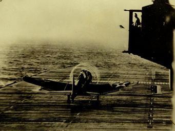| Keywords: monochrome outdoor Lot 9431-4: Objective: Japanese Base. Its propeller whirling in the morning fog, a U.S. Navy SBD “Dauntless” takes off from its carrier base, bound for Japanese-held Wake Island, where a combined sea-air attack destroyed gasoline stores, storehouses, hangars and other installations. Though not identified, photograph was probably taken onboard USS Enterprise (CV 6) in February 1942. Office of War Information photograph. (10/2/2015). Lot 9431-4: Objective: Japanese Base. Its propeller whirling in the morning fog, a U.S. Navy SBD “Dauntless” takes off from its carrier base, bound for Japanese-held Wake Island, where a combined sea-air attack destroyed gasoline stores, storehouses, hangars and other installations. Though not identified, photograph was probably taken onboard USS Enterprise (CV 6) in February 1942. Office of War Information photograph. (10/2/2015). |