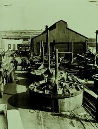 | Keywords: monochrome Lot-9432-5: Ships Will Strike First. The speed with which America is arming her merchant ships is assurance that she not only will continue to get war materials through to the Allies, but that supplies will flow in increasingly large quantities. U.S. cargo ships are being armed with machine-gun turrets to fight off aircraft and with four and five-inch guns which will enable them to hit first when U-boats are sighted. This series of pictures, made at an Atlantic Coast U.S. port, shows how the arming program is being pushed at top speed. Shown: Just as in the great tank and aircraft factories, the work moves on a fast assembly-line basis. Here, welders are at work on the line of machine gun nests. Office of War Information Photograph, 9-15 April 1942. Original photograph is small. (2015/12/18). Lot-9432-5: Ships Will Strike First. The speed with which America is arming her merchant ships is assurance that she not only will continue to get war materials through to the Allies, but that supplies will flow in increasingly large quantities. U.S. cargo ships are being armed with machine-gun turrets to fight off aircraft and with four and five-inch guns which will enable them to hit first when U-boats are sighted. This series of pictures, made at an Atlantic Coast U.S. port, shows how the arming program is being pushed at top speed. Shown: Just as in the great tank and aircraft factories, the work moves on a fast assembly-line basis. Here, welders are at work on the line of machine gun nests. Office of War Information Photograph, 9-15 April 1942. Original photograph is small. (2015/12/18). |