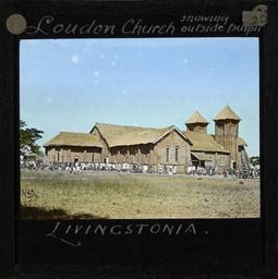 | Keywords: "Loudon Church, showing outside pulpit, Livingstonia", Malawi, ca.1910 (imp-cswc-GB-237-CSWC47-LS4-1-038).jpg en <br> Loudon Church showing outside pulpit Livingstonia Malawi ca 1910 Photograph of the exterior of Loudon Church The church is a large structure built of red brick with a thatched roof There are two bell towers to the front of the building The church congregation can be seen gathered outside Loudon is situated in northern Malawi ; This belongs to a series of Church of Scotland Foreign Missions Committee lantern slides relating to Rev Donald Fraser 1870-1933 Rev Donald Fraser the Scottish missionary was born in Argyllshire Scotland the son of a Free Church minister In his youth Rev Fraser helped found the Student Volunteer Movement in Britain and the World Student Christian Federation before beginning missionary service in Malawi with the Free Church of Scotland He worked in Malawi from 1896 until he returned to Scotland in 1925 He was first posted to Ekwendeni and later Embangweni Rev Fraser worked closely with the Ngoni people Photographer Unknown Filename imp-cswc-GB-237-CSWC47-LS4-1-038 tif Coverage date circa 1910 Part of collection International Mission Photography Archive ca 1860-ca 1960 Type images Part of subcollection Photographs from the Centre for the Study of World Christianity University of Edinburgh U K ca 1900-ca 1940s Repository name Centre for the Study of World Christianity Archival file impaunpub_Volume7/1487 url Repository address The University of Edinburgh School of Divinity New College Mound Place Edinburgh EH1 2LX United Kingdom Geographic subject country Malawi Format aacr2 1 lantern slide 8 x 8 cm Geographic subject continent Africa Rights Contact the repository for details Part of series Donald Fraser of Loudon LS4/1 Repository email divinity-CSWC ed ac uk Subject lcsh Keyword Church buildings Date created circa 1910 Publisher of the digital version University of Southern California Libraries Subject aat genre exterior views Format aat lantern slides Legacy record ID impa-m68536 Access conditions http //www ed ac uk/schools-departments/divinity/research/centres/world-christianity/collections-resources File GB 237 CSWC47/LS4/1/38 circa 1910 date created author http //digitallibrary usc edu/cdm/ref/collection/p15799coll123/id/64608 PD-old-70-1923 Magic lantern images Images from USC Digital Library uploaded by Fæ International Mission Photography Archive ca 1860-ca 1960 History of Malawi Livingstonia Rumphi District |