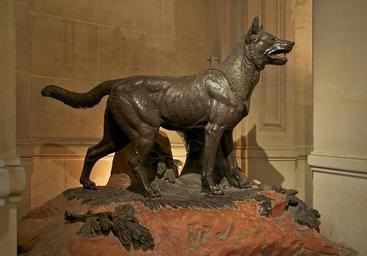 | Keywords: Loup Cain Chantilly.jpg Auguste Cain Auguste Cain Loup Statue en bronze sur socle en pierre Bronze statue on a stone pedestal 1879 bronze H 165 L 216 P 158 Museum Musée Condé 00000105094 object history credit line signé devant A CAIN; inscrit à gauche sur la pierre CHANTILLY/La Coharde 1879 accession number OA 2056 own by Jebulon thumb left By User Sailko PD-old Cc-zero Auguste Caïn Sculptures in the Musée Condé Statues of wolves 1879 bronze statues in France | ||||