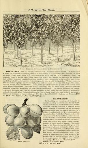 | Keywords: Lovett's illustrated catalogue of fruit and ornamental trees and plants for the autumn of 1891 (16976363986).jpg J T Lo ett Co Plums <br> Young Trees of Abundance Plum in Nursery Rows <br> ABUNDANCE This is a remarkable fruit indeed It is unlike any other plum In growth it Is <br> so strong and handsome as to render it worthy of being planted as an ornamental tree equaling in thrift <br> and beauty Keiffer pear which it even excels in early and profus bearing It is exceedingly hardy Its <br> propensity for early bearing is such that it loads in the nursery row bending the limbs with the weight of <br> fruit until they sometimes break and this is the case everu year the cureulio having no effect upon it the <br> eggs failing to hatch and produce the destructive grub the same as with the Spauldlng We have seen even <br> little one year old saplings but two feet high white with bloom and set heavily with large line plums <br> The fruit is large showy and beautiful Amber turning to a rich bright cherry color wiih a decided white <br> bloom and highly perfumed Flesh light yellow exceedingly juicy and tender and of a delicious sweetness <br> Impossible to describe Stone small and parts readily from the flesh For canning It Is also of the greatest <br> excellence Its season Is very earlu ripening in advance of other plums early in August at Monmouth <br> adding to its special value No one need longer be without plums; for all who plant trees of Abundance <br> will have an abundance of plums 1st c ea 50 ' doz 5 00; 100 25 00 Medium ea 25c ; doz 3 50 <br> 100 20 00 June Budded ea 25c ; doz 2 60; 100 15 00 <br> SPAULDING <br> The Spauldlng is a curcullo-proof plum and its <br> cureulio enduring proclivity is not Its only merit <br> Unlike most other so-called curcullo-proof plums of <br> which we have any knowledge it does not belong <br> to the Chickasaw or A merlcan species; but has de- <br> scended from the same species as Green Gage Coe's <br> Golden Drop Lombard etc It Is not exempt from <br> the attacks of the Little Turk any more than oth- <br> er varieties of the European Plum but for some rea- <br> son the wound is soon outgrown the plums develop <br> fair and perfect and no harm is done The tree is a <br> remarkable grower with leathery large rich dark <br> foliage It ripens middle of August The fruit is <br> large of the form shown yellowish green with <br> mai blings of a deeper green and a delicate white <br> bloom; flesh pale yellow exceedingly Arm of su- <br> gary sweetness though sprightly and of great rich- <br> ness parting readily from the small stone When <br> canned it presents not only a most attractive ap- <br> pearance but the quality is simply superb Owing <br> to t he great demand the supply of trees is limited <br> this spring 1st class ea 75c doz 7 50 <br> Medium ea 60c ; doz 6 00 <br> ĒT B ea 50c doz 5 00 42764489 136632 68527 Page 37 Text http //www biodiversitylibrary org/page/42764489 1891 10 5962/bhl title 68527 Henry G Gilbert Nursery and Seed Trade Catalog Collection ; J T Lovett Company ; J T Lovett Company NameFound Medium NameConfirmed Medium NameBankID 4904049 Biodiversity Heritage Library Lovett's illustrated catalogue of fruit and ornamental trees and plants for the autumn of 1891 Catalogs Commercial catalogs Fruit J T Lovett Company Little Silver New Jersey Plants Ornamental Seeds Shrubs Trees U S Department of Agriculture National Agricultural Library bhl page 42764489 dc identifier http //biodiversitylibrary org/page/42764489 bhlGardenStories Orchard Plums j t lovett company little silver new jersey plants ornamental u s department of agriculture national agricultural library bhlgardenstories Information field Flickr posted date ISOdate 2015-04-01 CC-BY-2 0 BioDivLibrary https //flickr com/photos/61021753 N02/16976363986 2015-08-23 22 04 57 cc-by-2 0 PD-old-70-1923 Plums Lovett's illustrated catalogue of fruit and ornamental trees and plants for the autumn of 1891 Photos uploaded from Flickr by FÃĶ using a script |