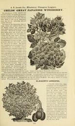 | Keywords: Lovett's illustrated catalogue of fruit and ornamental trees and plants for the autumn of 1891 (16814583958).jpg J T Lovett Co Wineberry Elaeagnus Longipes <br> CHILDS' GREAT JAPANESE WINEBERRY <br> The Introduction of this beautiful and <br> valuable novelty has excited an immense <br> amount of Interest and the Wineberry it- <br> self fully deserves all the praise that has <br> been given it both as an ornamental <br> plant and for the refreshing sub-acid <br> quality of its fruit <br> The canes of this interesting plant are <br> large robust and perfectly hardy; they <br> are thickly covered with purplish-red <br> hairs which extend along the stem to its <br> extremity The leaves are large tough <br> dark green above and silvery gray be- <br> neath Each berry is at first tightly en- <br> veloped by the large calyx forming a <br> sort of burr which is also covered with <br> purplish-red hairs so thickly as to present <br> the appearance of moss rose buds These <br> gradually open and turn back exposing <br> the fruit in all its beauty The berries <br> are of medium size as compared with our <br> raspberries but of a beautiful translu- <br> cent appearance running through all the <br> shades of amber to crimson as they ripen <br> There is a freshness and brilliancy about <br> them impossible to describe and we know <br> of nothing in the way of raspberries so at- <br> tractive A bush in full fruitiug is a sight <br> not readily to be forgotten and a decided <br> ornament to the garden In quality it is <br> good with a rich and sprightly flavor but <br> decidedly brisk sub-acid When cooked <br> it Is simply grand; surpassing by far <br> when canned the Huckleberry and all <br> other small fruits For jelly making it is <br> without an equal far exceeding for this <br> purpose the Currant Quince and Crab Apple Season of ripening at Monmouth early iu July <br> John Lewis Chllds says of it; Another season's trial and a general introduction has proved that this <br> grand new fruit is the greatest novelty of the age It is universally conceded that it is one of the most val- <br> uable introductions of this generation and it will be generally grown the world over Strong plants ea <br> 25c; doz 2 50; 100 15 00 Transplanted ea 50c; doz 5 00; 100 25 00 Bu mail if dei ired at prices <br> named When sent by express larger plants icill be f elected <br> EL AGNUS LONGIPES <br> A beautiful shrub from Japan <br> belonging to the Olive family Few <br> are aware how beautiful it is when <br> in fruit ami still less how good a <br> sauce its berries make The <br> shrubs grows to a height of from <br> Ave to six feet making a well <br> branched bush of great beauty; <br> leaves lougish-oval bright greeu <br> above aud silvery-white beueath <br> The blossoms appear in May in <br> great profusion small and pale <br> yellow iu color The berries are <br> ripe early in July and are oval in <br> shape of the size shown in the Il- <br> lustration bright scarlet and very <br> handsome Like cranberries the <br> fruit requires cooking and may <br> be used in the same manner It <br> is produced iu the greatest abun- <br> dance The bush is entirely hardy <br> and free from insect enemies <br> Ea 35c; Doz 3 50 42764467 136632 68527 Page 15 Text http //www biodiversitylibrary org/page/42764467 1891 10 5962/bhl title 68527 Henry G Gilbert Nursery and Seed Trade Catalog Collection ; J T Lovett Company ; J T Lovett Company NameFound Elaeagnus NameConfirmed Elaeagnus L EOLID 61896 NameFound Longipes NameConfirmed LONGIPES NameBankID 4503840 Biodiversity Heritage Library Lovett's illustrated catalogue of fruit and ornamental trees and plants for the autumn of 1891 Catalogs Commercial catalogs Fruit J T Lovett Company Little Silver New Jersey Plants Ornamental Seeds Shrubs Trees U S Department of Agriculture National Agricultural Library bhl page 42764467 dc identifier http //biodiversitylibrary org/page/42764467 bhlGardenStories Wineberry Elaeagnus longipes j t lovett company little silver new jersey plants ornamental u s department of agriculture national agricultural library bhlgardenstories Information field Flickr posted date ISOdate 2015-04-01 CC-BY-2 0 BioDivLibrary https //flickr com/photos/61021753 N02/16814583958 2015-08-23 22 04 07 cc-by-2 0 PD-old-70-1923 Lovett's illustrated catalogue of fruit and ornamental trees and plants for the autumn of 1891 Photos uploaded from Flickr by FĂŚ using a script |
