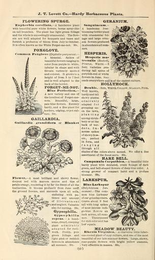 | Keywords: Lovett's illustrated catalogue of fruit and ornamental trees and plants for the autumn of 1891 (16814613808).jpg J T Lovett Co Hardy Herbaceous Plants <br> FLOWERING SPURGE <br> Euphorbia corollata A handsome plant <br> with beautiful pure white flowers borne spray-like <br> on tall branches The plant has light green foliage <br> and the whole is exceedingly ornamental The flow- <br> ers are well adapted for bouquets and vases and <br> furnish a profusion of bloom from July to October <br> It is often known as the White Forget-me-not 20c <br> FOXGLOVE <br> Common Foxglove Digitalis purpurea <br> A biennial Spikes of <br> beautiful flowers ranging in <br> color from purple to white <br> tubular in shape and with <br> throats variously spotted <br> and colored It grows to a <br> height of from 5 to 7 feet <br> and Is well adapted to the <br> back of the border <br> FORGET-ME-NOT <br> Blue Perfection <br> A new variety and one of <br> the loveliest of Forget-me- <br> nots Beautiful large <br> pale blue flowers Entirely <br> hardy and a fine plant for <br> borders edging or pot cul- <br> ture oOc <br> GAILLARDIA <br> Oaillardia randiflora or Blanket <br> GERANIUM <br> Sanguineum <br> A handsome free- <br> blooming border plant <br> with ornamental fol- <br> iage and large crim- <br> son flowers produced <br> in abundance all sum- <br> men <br> Flower A most brilliant and showy flower <br> deepest red with maroon centre and tips of <br> petals orange rendering it by far the finest of all the <br> Galllardias It blooms profusely from June until <br> the ground freezes and succeeds upon all soils <br> enduring with pa- <br> tience any amount <br> of ill-treatment <br> and neglect Valuable <br> also for cutting 20c <br> Gypsophilla <br> Gyps o p li i 1 1 a j <br> repens A hand- j <br> some dwarf creeping <br> plant admirably j <br> adapted for rock- ; <br> work Pretty pale ' <br> green foliage and ' <br> V ght pink or reddish <br> flowers in abundance <br> all summer 20c I <br> HESPERIS <br> Hesperis ma- <br> tronalis Rocket <br> Purple White <br> feet; varieties pro- <br> ducing tall spires of <br> purplish-red or white <br> flowers In June Suc- <br> ceeds everywhere and is of the easiest culture <br> HOLLYHOCK <br> Double Red White Yellow Scarlet Pink <br> Well known <br> hardy and tall <br> showy plants; <br> admirably <br> adapted for <br> grouping up- <br> on the lawn <br> plan 1 1 n g <br> among shrub- ' <br> bery or at the <br> back of bor- <br> de r s I m - <br> mense spikes <br> of showy flow- <br> ers perfect <br> in form and <br> ranging <br> through all <br> shades of the colors above named <br> assortment of the finest sorts 20c <br> HARE BELL <br> Campanula Carpathica A beautiful little <br> hardy plant with dentated ovate foliage of dark <br> green and bell-shaped flowers of deep blue color A <br> strong grower of compact habit and a profuse <br> bloomer 20c <br> LARKSPUR <br> Blue Larkspur <br> Delphinium for <br> mosum The com- <br> mon blue Larkspur <br> of our grandmothers <br> Grows about 3 feet <br> tall with long spikes <br> of most intense indi- ' <br> go-blue flowers an <br> inch across all sum- <br> mer Unsurpassed <br> for rich color and has <br> fev equals <br> MEADOW BEAUTY <br> Rliexia Virgiiiica A charming little tuber- <br> ous-rooted plant of easy culture and one of the most <br> beautiful of our late summer flowers Large showy <br> rosy-purple flowers with bright yellow stamens <br> Very effective in masses 20c <br> We offer a flne <br> 50 42764502 136632 68527 Page 50 Text http //www biodiversitylibrary org/page/42764502 1891 10 5962/bhl title 68527 Henry G Gilbert Nursery and Seed Trade Catalog Collection ; J T Lovett Company ; J T Lovett Company NameFound Campanula NameConfirmed Campanula subgen Campanula EOLID 24010291 NameFound Carpathica NameConfirmed Carpathica EOLID 4891254 NameBankID 4104300 NameFound Digitalis purpurea NameConfirmed Digitalis purpurea EOLID 578392 NameBankID 2655933 NameFound Euphorbia corollata NameConfirmed Euphorbia corollata EOLID 1145080 NameBankID 2651804 NameFound Gaillardia NameConfirmed Gaillardia Foug EOLID 38325 NameFound Gypsophilla NameConfirmed Gypsophilla NameBankID 1842227 NameFound Hesperis NameConfirmed Hesperis EOLID 71309 NameBankID 2648753 NameFound Oaillardia randiflora NameConfirmed Gaillardia grandiflora Pursh EOLID 479475 NameFound Sanguineum Biodiversity Heritage Library Lovett's illustrated catalogue of fruit and ornamental trees and plants for the autumn of 1891 Catalogs Commercial catalogs J T Lovett Company Little Silver New Jersey Plants Ornamental Seeds Shrubs U S Department of Agriculture National Agricultural Library bhl page 42764502 dc identifier http //biodiversitylibrary org/page/42764502 bhlGardenStories Foxglove Geranium Gaillardia Larspur Hollyhock j t lovett company little silver new jersey plants ornamental u s department of agriculture national agricultural library bhlgardenstories Information field Flickr posted date ISOdate 2015-04-01 CC-BY-2 0 BioDivLibrary https //flickr com/photos/61021753 N02/16814613808 2015-08-23 20 53 08 cc-by-2 0 PD-old-70-1923 Geranium Gaillardia Lovett's illustrated catalogue of fruit and ornamental trees and plants for the autumn of 1891 Photos uploaded from Flickr by Fæ using a script |