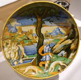 Keywords: Low-footed Dish with Scene of Diana and Actaeon, artist unknown, Italy, c. 1540-1545, tin-glazed earthenware - Fogg Art Museum, Harvard University - DSC01031.jpg en Exhibit in the Fogg Art Museum Harvard University Cambridge Massachusetts USA This artwork is in the public domain because the artist died more than 70 years ago 2015-04-11 11 26 26 own Daderot other versions PD-old-70 cc-zero Ceramics in the Fogg Art Museum Italian maiolica Diana and Actaeon on maiolica