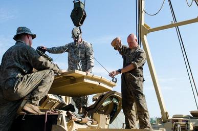 | Keywords: outdoor Sgt. 1st Class Clayton Felton, a motor sergeant, and Spc. Devin Marshal, a small arms artillery repairer, with the 1-163rd Combined Arms Battalion from Montana Army National Guard and Spc. Jade Parsons, a medic with 116th Brigade Support Battalion from Idaho Army National Guard from Boise, Idaho secure an engine cover on a Bradley Fighting Vehicle at the Romanian Land Forces Combat Training Center in Cincu, Romania, July 22, 2016. Soldiers with the 1-163rd will support the 116th Cavalry Brigade Combat Team from Boise, Idaho during multi-national exercise Saber Guardian, a multinational military exercise involving approximately 2,800 military personnel from ten nations including Armenia, Azerbaijan, Bulgaria, Canada, Georgia, Moldova, Poland, Romania, Turkey, Ukraine and the U.S. The objectives of this exercise are to build multinational, regional and joint partnership capacity by enhancing military relationships, exchanging professional experiences, and improving interoperability between the land forces from the participating countries. Saber Guardian will begin July 27 and finish August 7, 2016. (U.S. Army Photo by Staff Sgt. E. James Omelina, 115th Mobile Public Affairs Detachment). Sgt. 1st Class Clayton Felton, a motor sergeant, and Spc. Devin Marshal, a small arms artillery repairer, with the 1-163rd Combined Arms Battalion from Montana Army National Guard and Spc. Jade Parsons, a medic with 116th Brigade Support Battalion from Idaho Army National Guard from Boise, Idaho secure an engine cover on a Bradley Fighting Vehicle at the Romanian Land Forces Combat Training Center in Cincu, Romania, July 22, 2016. Soldiers with the 1-163rd will support the 116th Cavalry Brigade Combat Team from Boise, Idaho during multi-national exercise Saber Guardian, a multinational military exercise involving approximately 2,800 military personnel from ten nations including Armenia, Azerbaijan, Bulgaria, Canada, Georgia, Moldova, Poland, Romania, Turkey, Ukraine and the U.S. The objectives of this exercise are to build multinational, regional and joint partnership capacity by enhancing military relationships, exchanging professional experiences, and improving interoperability between the land forces from the participating countries. Saber Guardian will begin July 27 and finish August 7, 2016. (U.S. Army Photo by Staff Sgt. E. James Omelina, 115th Mobile Public Affairs Detachment). |
