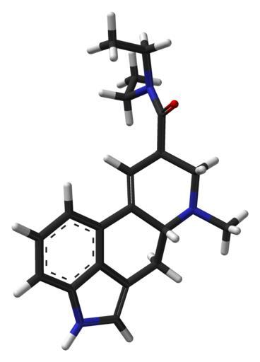 | Keywords: LSD-from-xtal-and-Spartan-PM3-3D-sticks-web.png Stick model of the lysergic acid diethylamide LSD molecule C<sub>20</sub>H<sub>25</sub>N<sub>3</sub>O Colour code Carbon C grey-black Hydrogen H white Nitrogen N blue Oxygen O red Structure based on that found in the related salt LSD o-iodobenzoate monohydrate determined by X-ray crystallography in http //molpharm aspetjournals org/content/9/1/23 abstract Molecular Pharmacology 1973 9 23-32 Model manipulated in http //www crystalmaker com/ CrystalMaker 8 3 The structure of the LSD+H<sup>+</sup> cation from the above crystal structure was opened in http //www wavefun com/products/macintosh/Student/mac_student html Spartan Student 4 1 one hydrogen atom on the R<sub>3</sub>NH<sup>+</sup> group was deleted yielding the neutral LSD molecule Its structure was then refined with the PM3 semi-empirical method Image generated in http //accelrys com/products/discovery-studio/visualization/discovery-studio-visualizer html Accelrys DS Visualizer Own 2011-03-13 Ben Mills Benjah-bmm27 Images by Ben Mills Lysergic acid diethylamide |