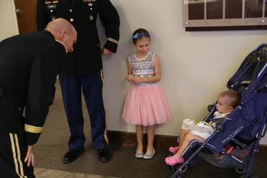 | Keywords: Lt. Gen. Kenneth R. Dahl, commanding general for U.S. Army Installation Management Command, greets Maj. Mark A. Fisher and his family at IMCOM headquarters Sept. 30, 2016, in advance of his promotion ceremony to lieutenant colonel. Family, coworkers and friends gathered at the operations center to hear the call to orders and join together in a receiving line and reception afterward. Dahl read an excerpt from a vintage copy of "The Armed Forces Officer" to inspire Fisher and the audience. (U.S. Army photo by Robert Dozier) |