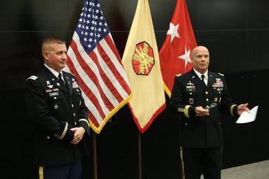 | Keywords: Lt. Gen. Kenneth R. Dahl, commanding general for U.S. Army Installation Management Command, greets Maj. Mark A. Fisher and his family at IMCOM headquarters Sept. 30, 2016, in advance of his promotion ceremony to lieutenant colonel. Family, coworkers and friends gathered at the operations center to hear the call to orders and join together in a receiving line and reception afterward. Dahl read an excerpt from a vintage copy of "The Armed Forces Officer" to inspire Fisher and the audience. (U.S. Army photo by Robert Dozier) |