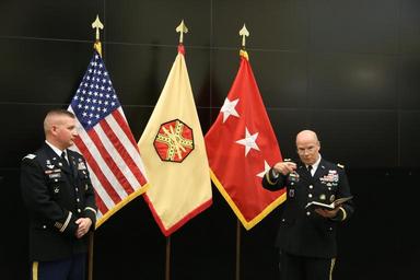 | Keywords: Lt. Gen. Kenneth R. Dahl, commanding general for U.S. Army Installation Management Command, greets Maj. Mark A. Fisher and his family at IMCOM headquarters Sept. 30, 2016, in advance of his promotion ceremony to lieutenant colonel. Family, coworkers and friends gathered at the operations center to hear the call to orders and join together in a receiving line and reception afterward. Dahl read an excerpt from a vintage copy of "The Armed Forces Officer" to inspire Fisher and the audience. (U.S. Army photo by Robert Dozier) |