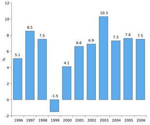 | Keywords: Lt real gdp growth.svg Annual change in the real GDP of Lithuania from 1996 to 2006 Eurostat database GDP - Constant prices percentage change on previous period graph own work 2007-06-18 Jkv PD-Own R source R version 2 3 www r-project org Eurostat GDP constant prices percentage change on previous period Lithuania 1996 - 2006 x <- c 5 1 8 5 7 5 -1 5 4 1 6 6 6 9 10 3 7 3 7 6 7 5 names x <- 1996 2006 library RSvgDevice devSVG lt_real_gdp_growth svg width 12 height 10 par mar c 3 2 4 1 0 las 1 mgp c 2 2 1 0 cex 2 y <- barplot x ylim c -2 12 ylab space 4 col steelblue2 xlim c 2 16 xaxs i text y c x1 3+ 3 3 x5 11+ 3 format x digits 2 axis 1 c 2 y+ 7 labels F dev off Economic statistics for Lithuania GDP bar charts Created with R Eurostat |