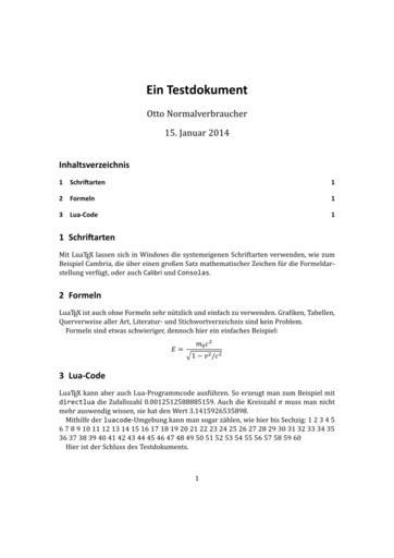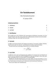 | Keywords: LuaTeX Output DE.svg Aussehen einer mit LuaTeX erstellten pdf-Datei nach dem Kompilieren des Quelltextes deutschsprachige Version self created using LuaTeX-0 76 0 from Source see below 2014-01-15 svg from Lumu <span class signature-talk >talk</span> LuaTeX source <source lang latex > \documentclassa4paper scrartcl \usepackage polyglossia \setdefaultlanguagespelling new babelshorthands true german \usepackage fontspec \usepackage unicode-math \usepackage luacode \setromanfont Cambria \setsansfont Calibri \setmonofont Consolas \setmathfont Cambria Math \title Ein Testdokument \author Otto Normalverbraucher \date 15 Januar 2014 \begin document \maketitle \tableofcontents \section Schriftarten Mit Lua\TeX lassen sich in Windows die systemeigenen Schriftarten verwenden wie zum Beispiel Cambria die über einen großen Satz mathematischer Zeichen für die Formeldarstellung verfügt oder auch \textsf Calibri und \texttt Consolas \section Formeln Lua\TeX ist auch ohne Formeln sehr nützlich und einfach zu verwenden Grafiken Tabellen Querverweise aller Art Literatur- und Stichwortverzeichnis sind kein Problem Formeln sind etwas schwieriger dennoch hier ein einfaches Beispiel \begin displaymath E \frac m_ 0 c 2 \sqrt 1-v 2 /c 2 \end displaymath \section Lua-Code Lua\TeX kann aber auch Lua-Programmcode ausführen So erzeugt man zum Beispiel mit \texttt directlua die Zufallszahl \directlua tex print math random Auch die Kreiszahl \pi muss man nicht mehr auswendig wissen sie hat den Wert \directlua tex print math pi Mithilfe der \texttt luacode -Umgebung kann man sogar zählen wie hier bis Sechzig \begin luacode for x 1 60 do tex print x end \end luacode Hier ist der Schluss des Testdokuments \end document </source> Images with LaTeX source code LuaTeX |