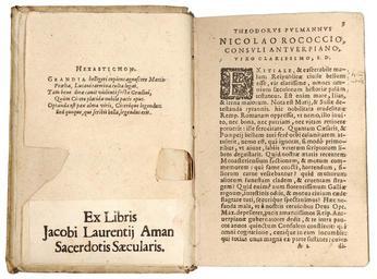 | Keywords: Lucanus, De bello civili ed. Pulmann (Plantin 1592), p. 002-003.jpg Lucan ™s De bello civili alias Pharsalia edited by Theodor Pulmann also Pulman or Poelmann printed by the Officina Plantiniana Plantin and Johannes/Jan Moretus in Antwerp in 1592 <br/> On the left page 2 you see a Neolatin poem Hexastichon about Lucan ™s work and the ex-libris of a former owner On the right page 3 begins Pulmann ™s foreword a dedication letter to Nicolaus Rococcius This foreword is dated at the end to 1564 the year of Pulmann ™s 1st edition of Lucan ™s poem and treats the cruels of civil wars from ancient Rome to Pulmann ™s own time Lucans Epos De bello civili auch Pharsalia herausgegeben von Theodor Pulmann auch Pulman oder Poelmann gedruckt von der Officina Plantiniana Plantin und Johannes/Jan Moretus in Antwerpen 1592 <br/> Links ein neulateinisches Gedicht Hexastichon über Lucans Werk und das Exlibris eines Vorbesitzers Auf der rechten Seite 3 beginnt Pulmanns Vorwort ein Dedikationsbrief an Nicolaus Rococcius Dieses Vorwort ist am Ende auf 1564 datiert das Jahr von Pulmanns erster Lucan-Ausgabe und behandelt die Schrecken der Bürgerkriege vom alten Rom bis zu Pulmanns eigener Zeit own Foreword by Theodor Pulmann also Pulman or Poelmann Book printed by the Officina Plantiniana Plantin/Moretus Antwerp Scan by Aristeas 1592 book printed ; 2010-04-11 scanned <gallery> File Lucanus De bello civili ed Pulmann Plantin 1592 title page jpg Title page of the edition File Lucanus De bello civili ed Pulmann Plantin 1592 p 004-005 jpg The next two pages end of the foreword </gallery> PD-old 1592 books Text pages Pharsalia Jan Moretus Ex libris |