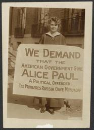 | Keywords: Lucy Branham 274007v.jpg Summary Informal portrait full-length Lucy Branham facing forward standing in front of a building and holding a sign We Demand That The American Government Give Alice Paul A Political Offender The Privileges Russia Gave Miyukoff Lucy G Branham of Baltimore Md an organizer for the NWP was a graduate of Washington College who earned graduate degrees at Johns Hopkins and Columbia Branham was arrested picketing Sept 1917 and sentenced to 60 days in Occoquan Workhouse and District Jail She was a speaker in the Prison Special tour of Feb-Mar 1919 Source Doris Stevens Jailed for Freedom New York Boni and Liveright 1920 355 1 photograph print 7 x 5 in accession number Call Number Location National Woman's Party Records Group II Container II 274 Folder Individual Photographs Nos 18-70 B Source Collection Records of the National Woman's Party institution Library of Congress Manuscript Division http //hdl loc gov/loc mss/mnwp 274007 PD-1923 PD-Harris-Ewing Lucy Gwynne Branham Alice Paul |